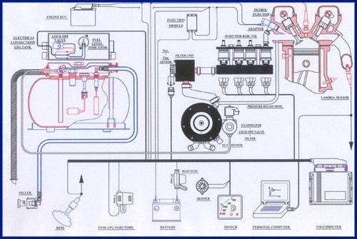 Das Skizze zeigt den schematischen Aufbau eines bivalenten Gas / Benzinmotors mit sequenzieller Gaseinspritzung "VSI" der Firma Prins aus den Niederlanden.